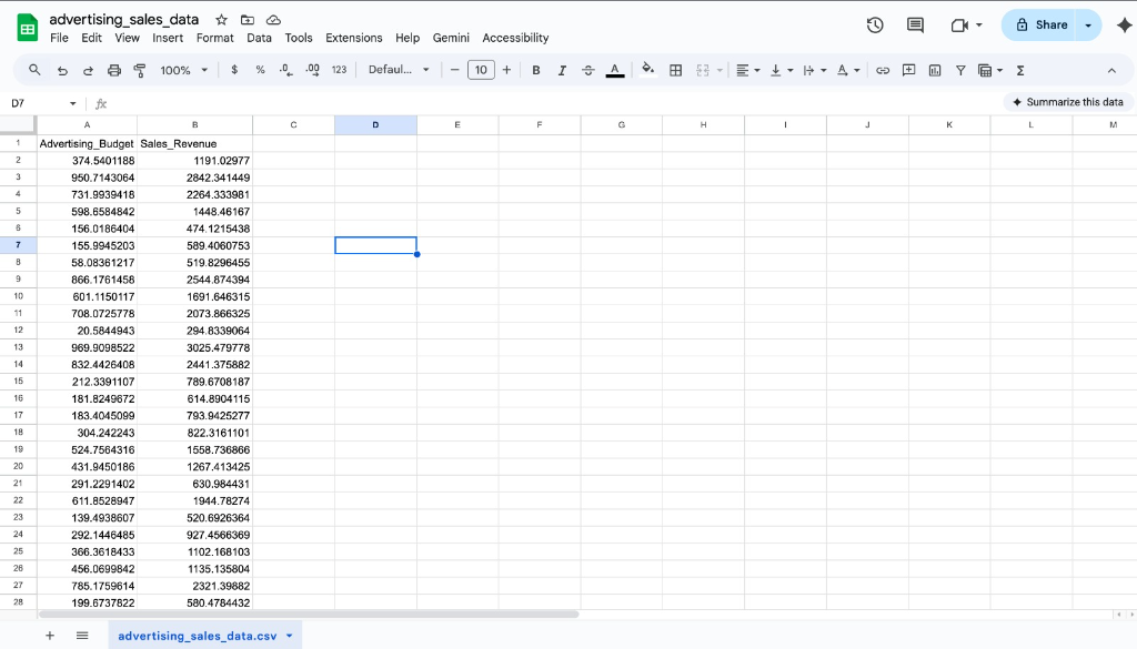 Two columns: Advertising_Budget and Sales_Revenue. Simple, clean, ready to analyze.