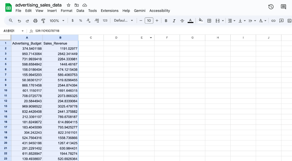 For this tutorial, I am using a dataset with 100 rows of advertising budget and sales revenue data. This is the kind of real-world scenario you might actually encounter: trying to see if there is a relationship between how much you spend on ads and how much revenue you generate.